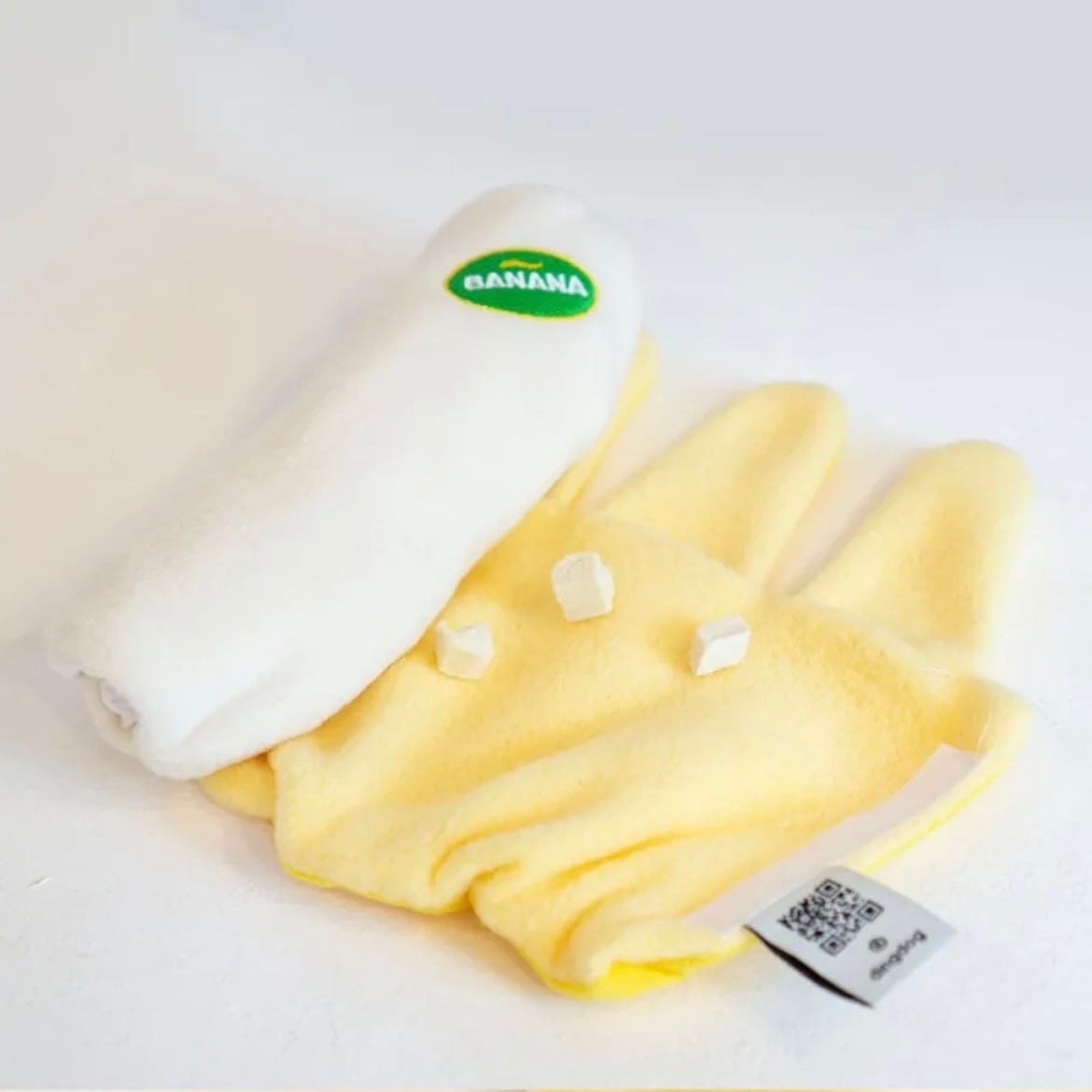 バナナのノーズワークトイは、開くと内側に7つのポケットがあります。おやつを隠して丸めれば完成し、バナナ全体がシャカシャカ音がします。マジックテープが付いているため、固定することができ、力加減で難易度を調整できます。サイズ感もちょうど良く、飼い主と一緒に楽しめるおもちゃです。