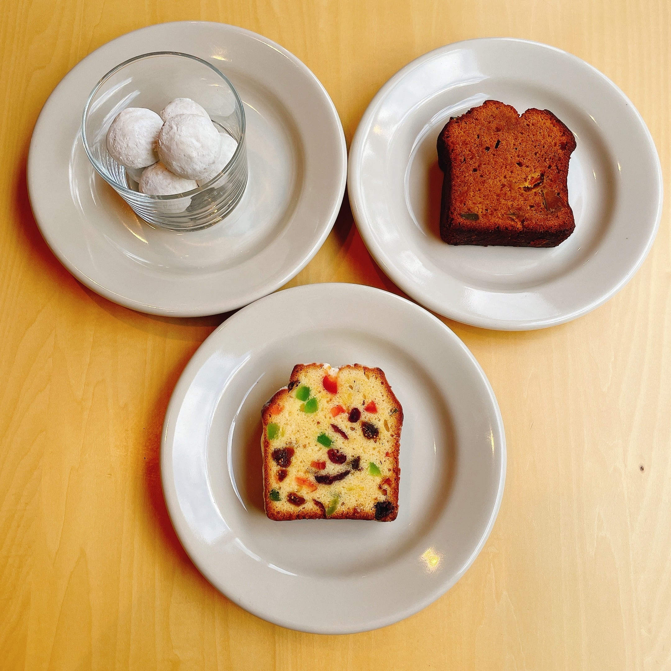 いちじく、ドライクランベリーをラム酒につけて、ホワイトチョコを生地に練り込んでしっとりとしたシュトーレン風に仕上げました。胡桃の食感も楽しめます。バターを塗り、粉糖をまぶしてリッチな味わいです。