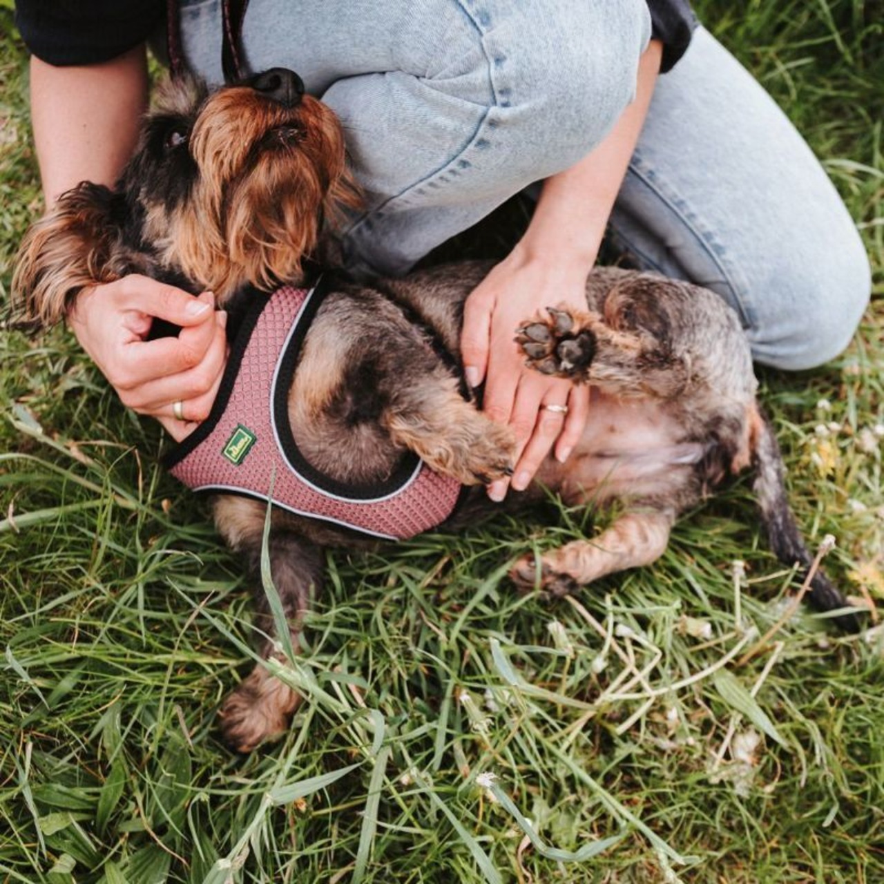 非常に軽く、通気性の良いこのハーネスは、装着前に水に浸すことにより、暑い日にはクーリング効果を得ることもできます。